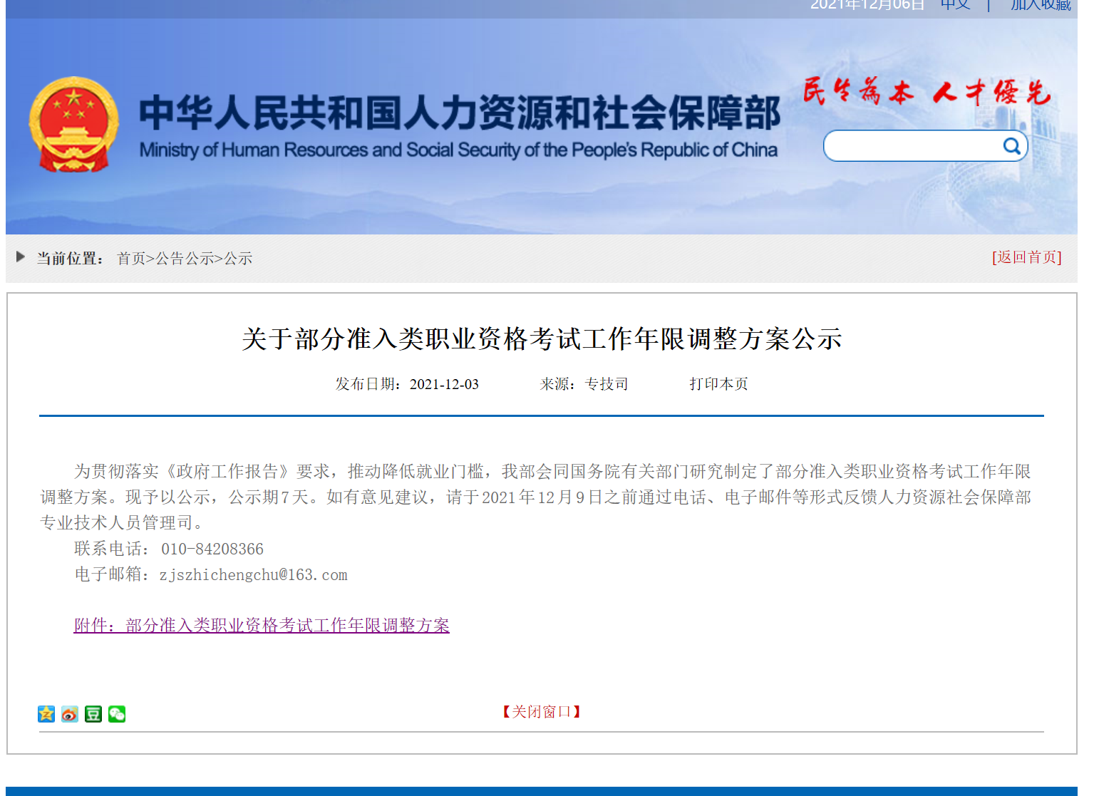 (2021年12月6日)建凱造價部整理發(fā)布《關(guān)于部分準入類職業(yè)資格考試工作年限調(diào)整方案公示》