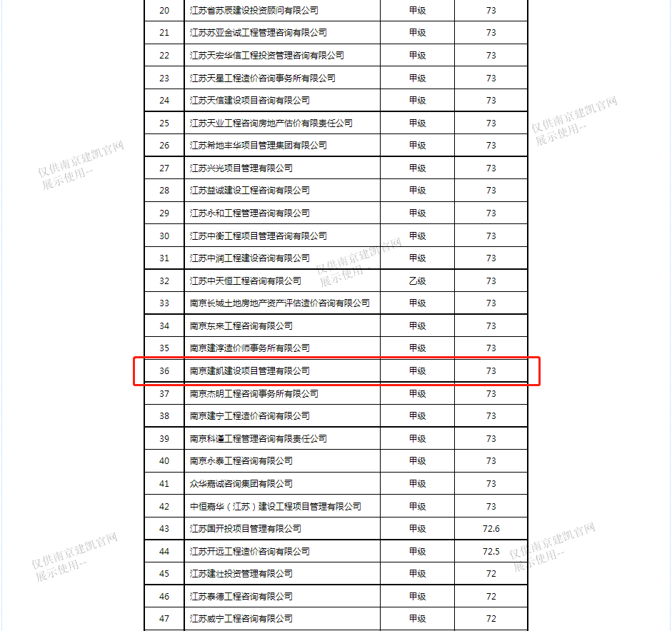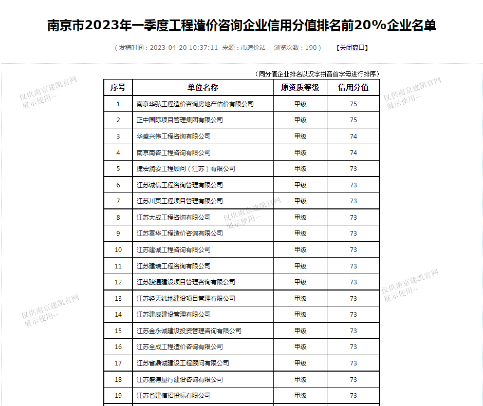 恭喜我司入選“南京市2023年一季度工程造價(jià)咨詢企業(yè)信用分值排名前20%企業(yè)名單”