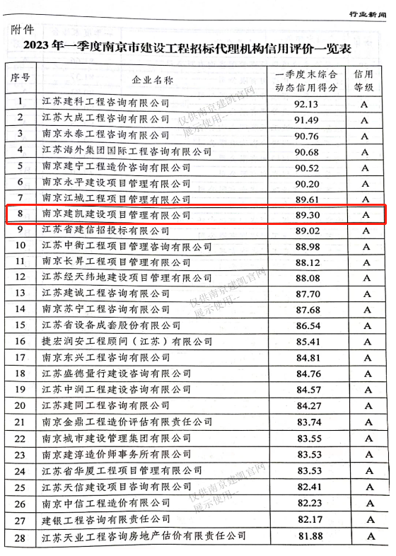 熱烈祝賀我司招標(biāo)代理機(jī)構(gòu)在2023年第一季度南京市建設(shè)工程招標(biāo)代理機(jī)構(gòu)信用評價綜合得分89.30分,全市排名第八名