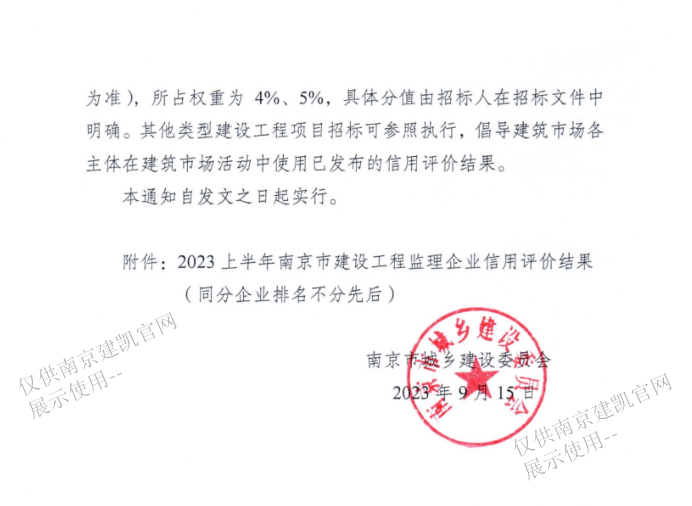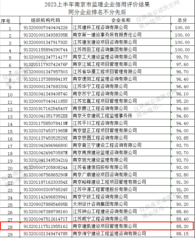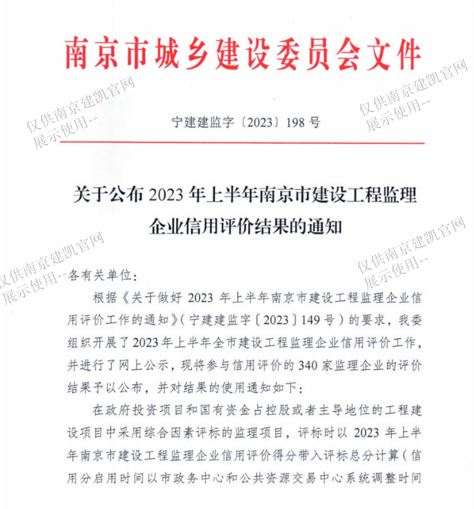 我司監(jiān)理企業(yè)在2023年上半年南京市建設(shè)工程監(jiān)理企業(yè)信用評(píng)價(jià)綜合得分88.30分