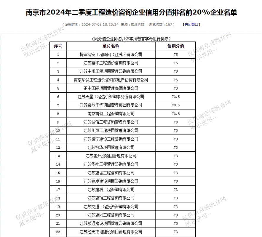 恭喜我司入選“南京市2024年二季度工程造價咨詢企業(yè)信用分值排名前20%企業(yè)名單”