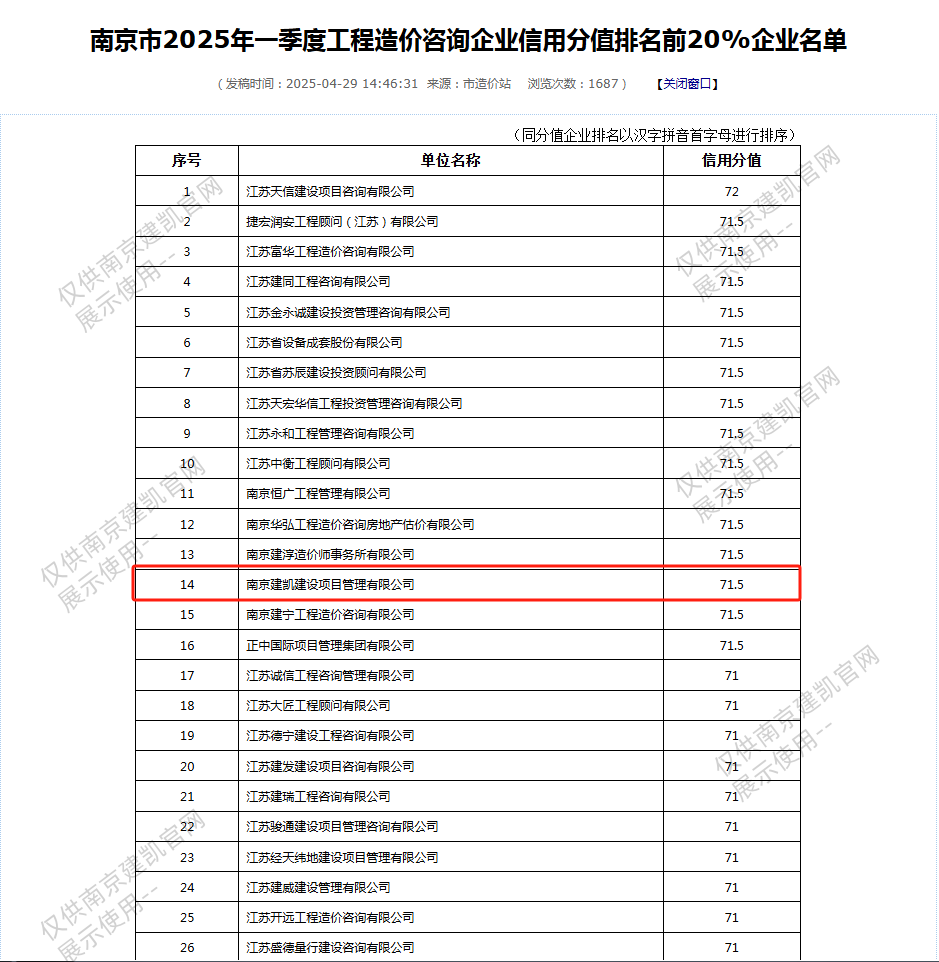 恭喜我司入選“南京市2025年一季度工程造價咨詢企業(yè)信用分值排名前20%企業(yè)名單”
