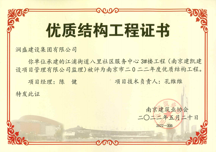 (2022年05月20日)江浦街道八里社區(qū)服務(wù)中心項目榮獲《南京市2022年度優(yōu)質(zhì)結(jié)構(gòu)工程》