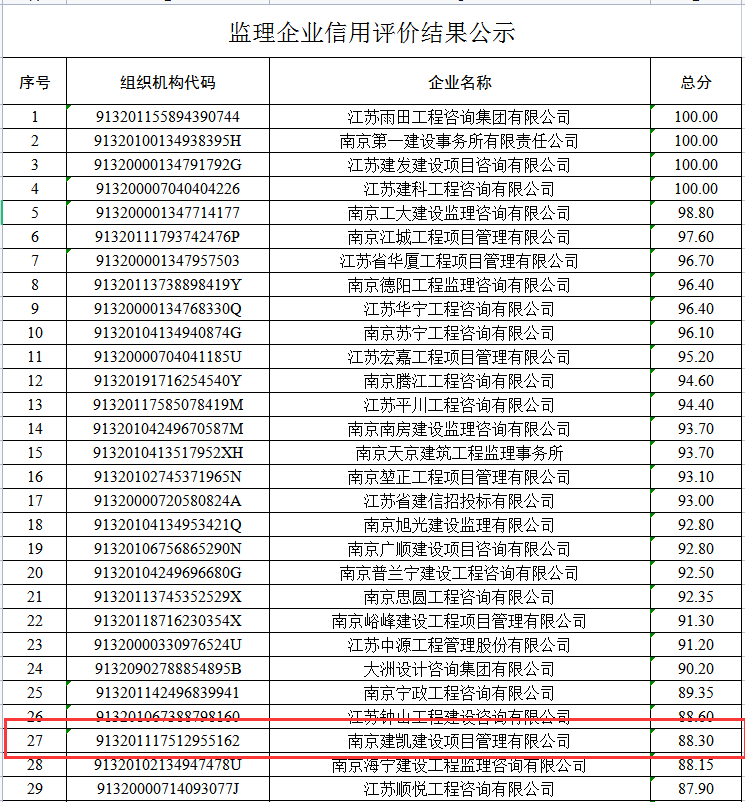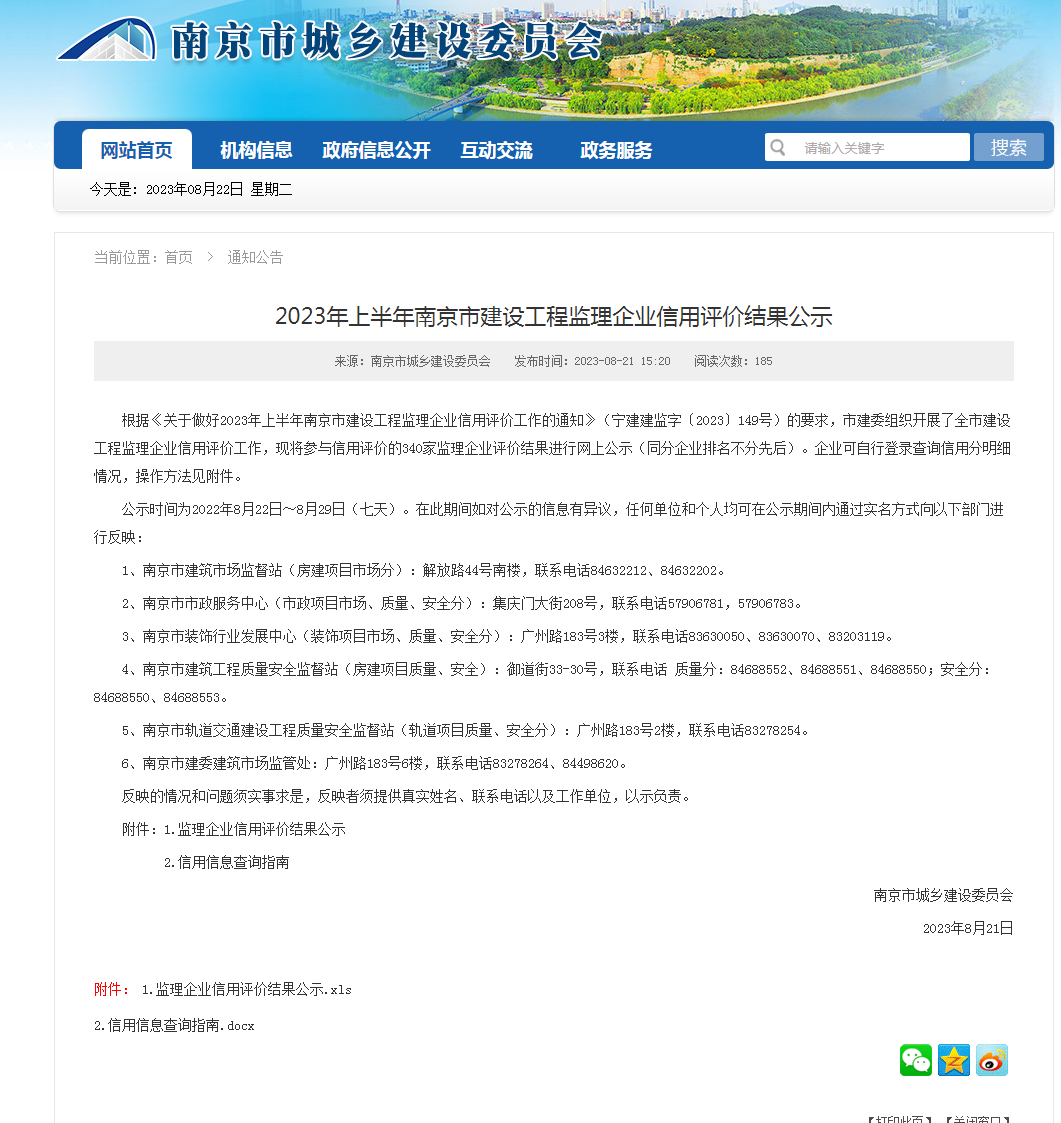 (2023年8月21日)市建委《2023年上半年南京市建設(shè)工程監(jiān)理企業(yè)信用評(píng)價(jià)結(jié)果公示》