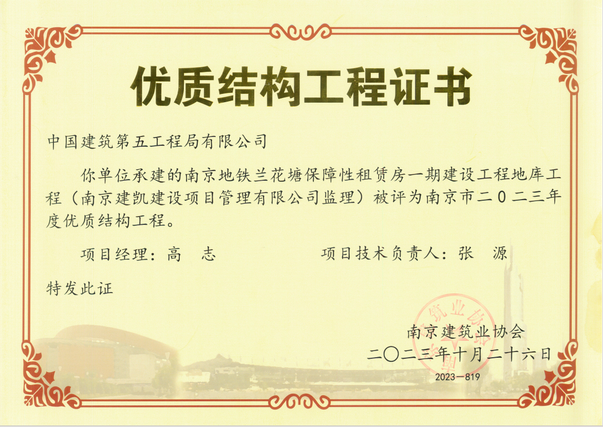 南京地鐵蘭花塘保障性租賃房一期建設(shè)工程 1#樓工程榮獲“優(yōu)質(zhì)結(jié)構(gòu)工程證書”