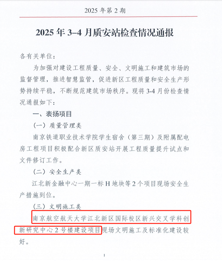 南京航空航天大學江北新區(qū)國際校區(qū)新興交叉學科創(chuàng)新研究中心2#樓項目榮獲區(qū)通報表揚